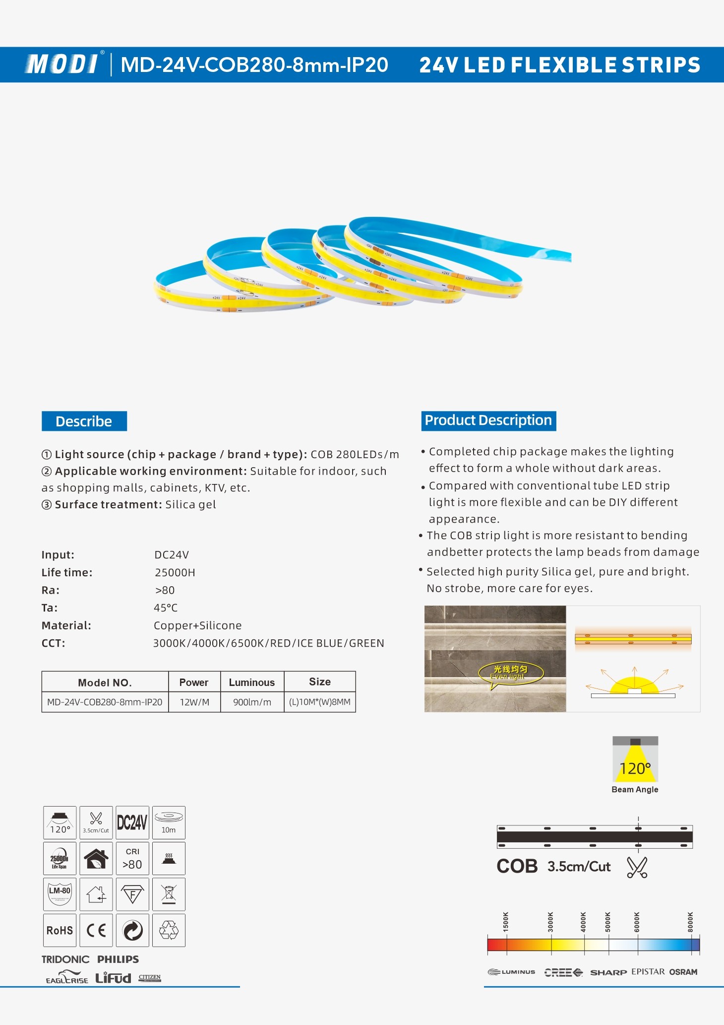 Model NO.: MD-24V-COB280-8mm-IP20